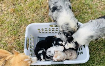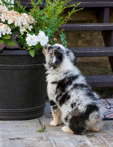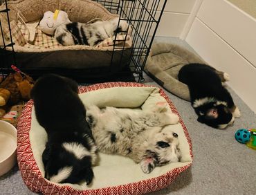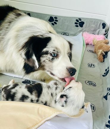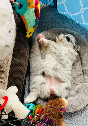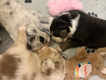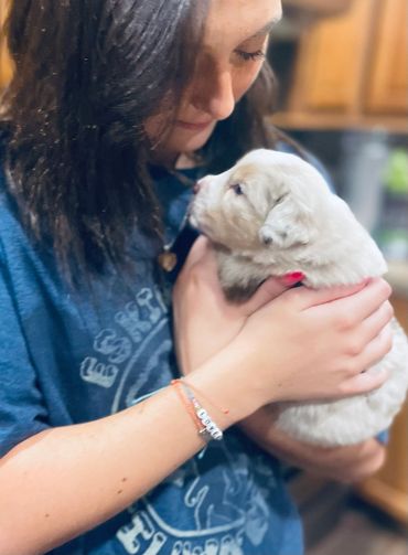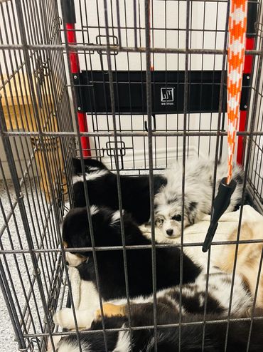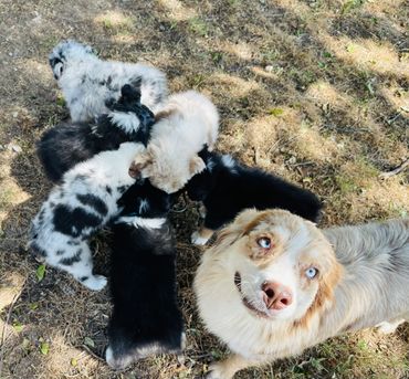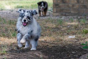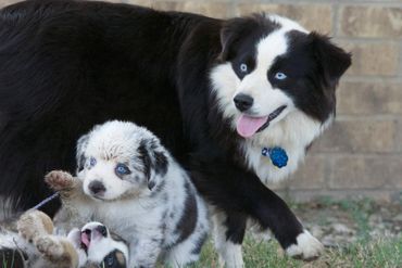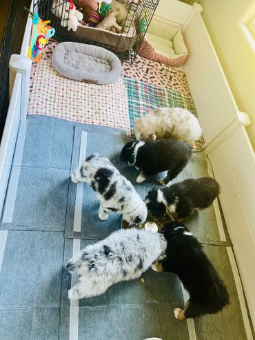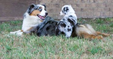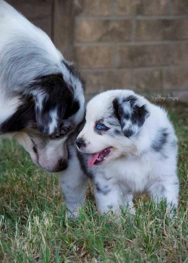 Our Aussie puppies are socialized to barn kitties, other Aussies, our pet goat and mini mare as well as desensitized to all the sights and sounds of a small but active ranch including tractors to equipment trailers and not to mention our busy household atmosphere.